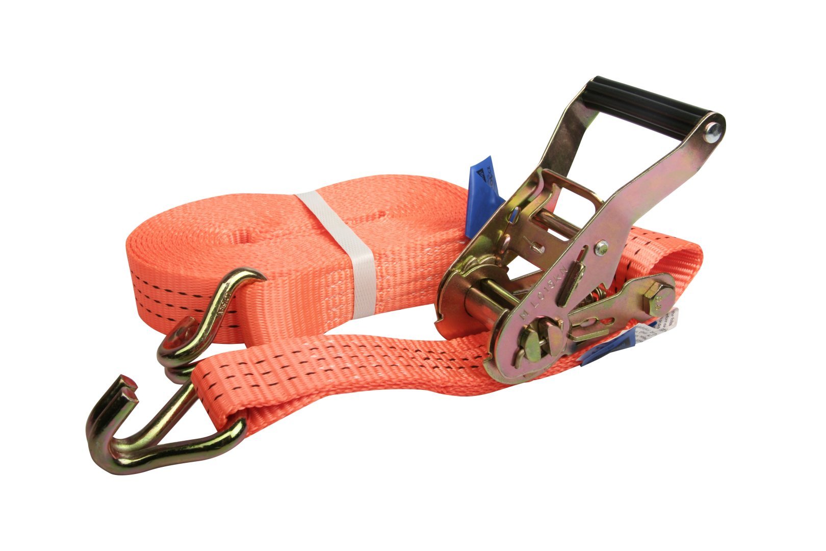 POPIS: Dvojdielny upínací pás s račňou pre zaistenie nákladu zakončený hákmi. Račňa je celokovového prevedenia s istiacim mechanizmom, popruhem šírky 35 mm, dĺžkou 5 m. Upínací pás sa vyznačuje pevnosťou v ťahu 1500 kg, pri objatí nákladu 3000 kg. Pri upínaní nákladu doporučujeme používať ochranné prvky. Bez použitia ochranných prvkov môže dôjsť k poškodeniu upínacieho pásu. Upínací pás nepoužívajte ak je poškodený! Je zakázáné používať upínacie pásy k zdvihaniu bremien. Naväzované, zauzlované a inak neodborne upravované upínacie pásy nesmú byť použité.